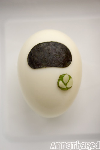 I knew this wouldn’t hold his appetite until the dinner, so I decided to add a boiled egg. I was going to make EVE like the one I made in the Wall-E bento, but that would require me to dying kamaboko (fish cake) for her eyes. Besides, it’d be kind of boring to make the same EVE, so I decided to make even simpler “EVE in hibernation mode (?).”